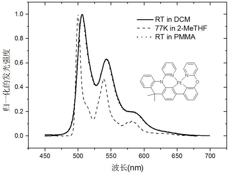 1.一种基于氧原子链接且含有苯基吖啶的四齿环金属铂(II)配合物,其特征在于,所述四齿环金属铂配合物具有通式(I)的结构:其中:R1、R2、R3、R4和R5各自独立地表示单基取代、双基取代、三基取代、四基取代或者无取代,且R1、R2、R3、R4和R5各自独立地为氢、氘、烷基、芳基、环烷基、杂环基、杂芳基或其组合;