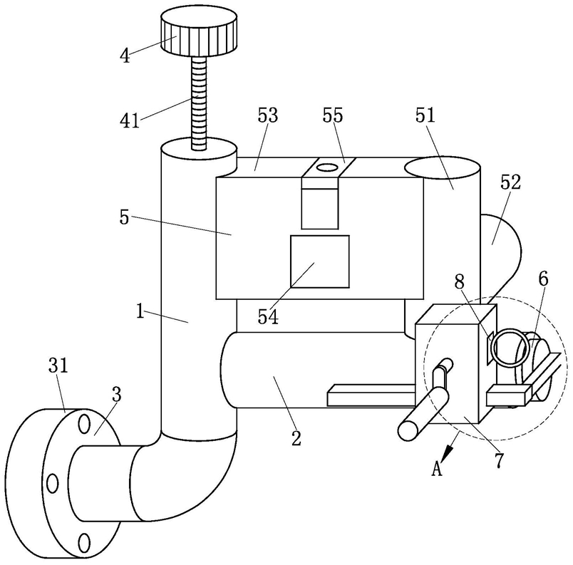 5.根据权利要求4所述的一种方便更换滤网的阀门,其特征在于:所述安装结构(7)包括固定套(71)、齿条(72)、安装杆(73)、摇把(74)和齿轮(75),所述固定套(71)固定于所述固定管(2)的外部,在所述固定套(71)的内部滑动连接有所述齿条(72),在所述齿条(72)的一端呈垂直关系固定所述安装杆(73),且所述安装杆(73)与所述抽拉板(61)固定,在所述固定套(71)的内部转动连接有所述摇把(74),在所述摇把(74)的外部固定所述齿轮(75),且所述齿轮(75)与所述固定套(71)转动连接,所述齿轮(75)与所述齿条(72)啮合。