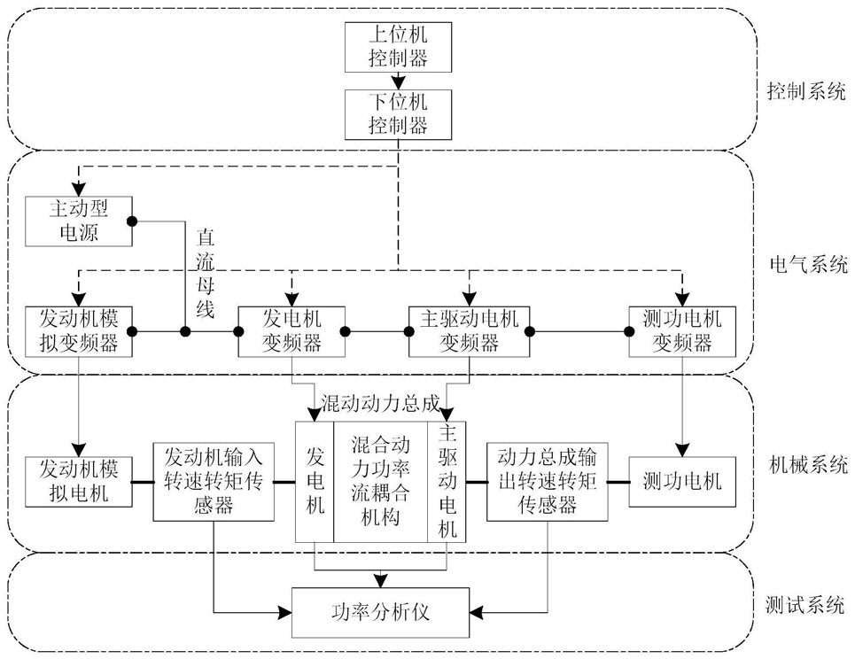 所述功率分析仪用于读取所述主驱动电机、所述发电机、所述发动机输入转速转矩传感器和动力总成输出转速转矩传感器的测试数据,并根据所述测试数据确定混合动力总成不同工况下功率流的耦合效率;