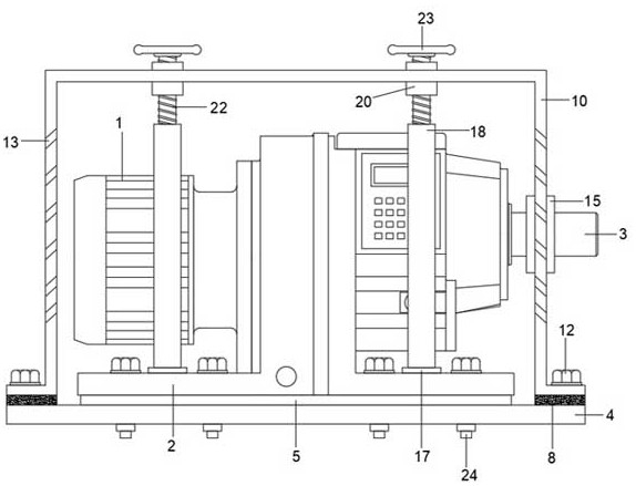 2.根据权利要求1所述的一种新能源汽车电机的减震装置,其特征在于:每个所述螺纹杆(22)远离限位套筒(18)的一端分别穿过位置相匹配的限位连接筒(20)并与其内壁开凿的内螺槽(21)螺纹连接,且每个所述螺纹杆(22)穿过限位连接筒(20)内部的一端分别与调节把手(23)的底部固定连接。