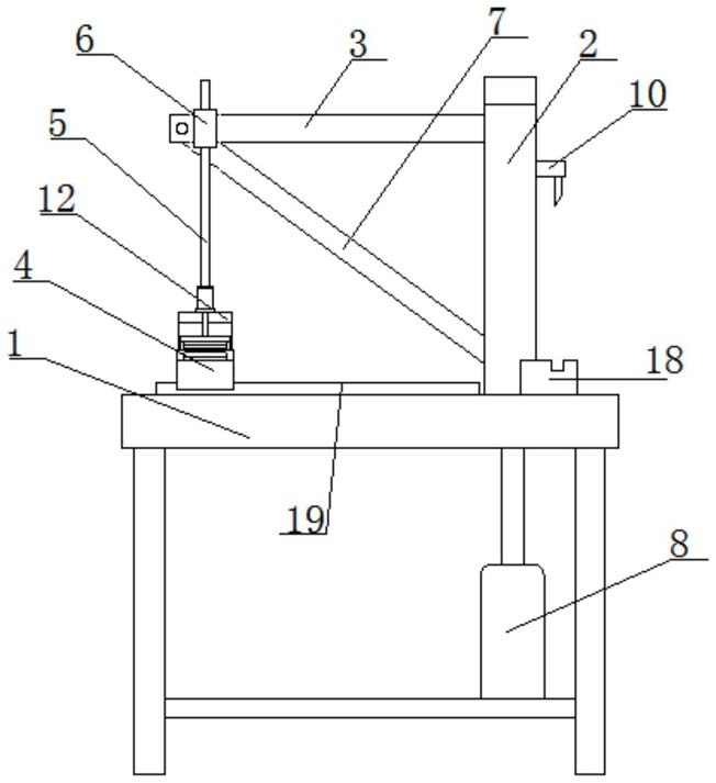 1.一种电缆自动等距压紧切割机构,包括工作台(1),其特征在于,所述工作台(1)上设置有一个矩形门框,所述矩形门框内设置有切刀,所述切刀的垂直下方设置有刀座,所述切刀通过L形板连接到升降气缸的活塞杆的端部,所述升降气缸的活塞杆垂直设置,能够带动切刀垂直移动,所述矩形门框内侧水平对称连接有两个转动杆,所述转动杆的末端均设置有拉杆,拉杆的末端设置有滑块,所述矩形门框内侧面开设有竖直的滑轨,所述滑块置于滑轨中,两个所述滑块通过一根水平杆连接,所述水平杆的中部与活塞杆连接,活塞杆升降过程中带动滑块同步升降;