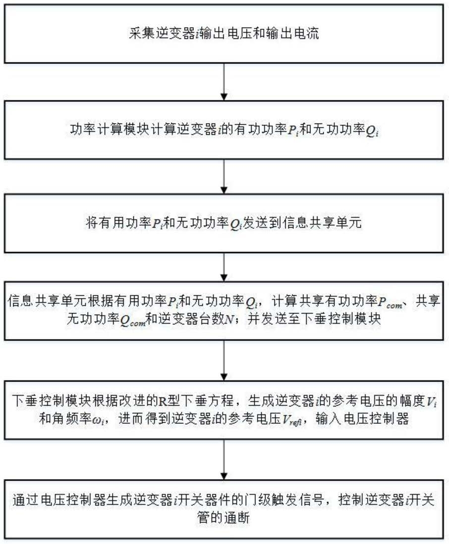 下垂控制模块根据改进的R型下垂方程,生成逆变器i的参考电压的幅度Vi和角频率ωi,进而得到逆变器i的参考电压vrefi,输入电压控制器;