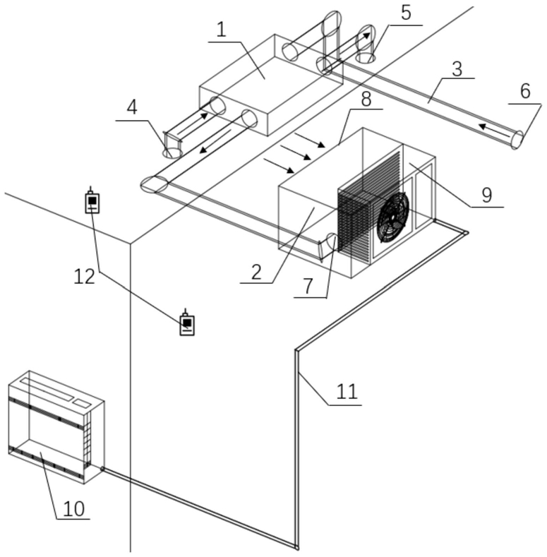 室内空气从室内风进口(4)进入显热交换器(1),进行热交换后从室内风出口(5)被送回到室内;室外空气从室外风进口(6)通过风管(3)进入显热交换器(1)进行热交换后成为预热空气,通过风管(3)从室外风出口(7)进入预热混合箱(2),与另一部分从预热混合箱进口(8)进入的室外空气混合,然后进入空气源热泵室外机(9)进行换热;