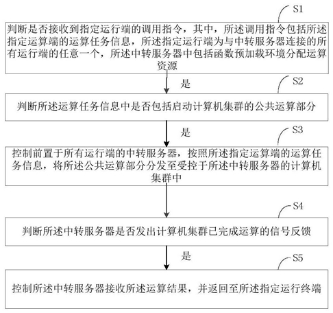 1.一种基于函数预加载环境的运算方法,其特征在于,包括:判断是否接收到指定运行端的调用指令,其中,所述调用指令包括所述指定运算端的运算任务信息,所述指定运行端为与中转服务器连接的所有运行端的任意一个,所述中转服务器中包括函数预加载环境分配运算资源;若是,则判断所述运算任务信息中是否包括启动计算机集群的公共运算部分;若是,则控制前置于所有运行端的中转服务器,按照所述指定运算端的运算任务信息,将所述公共运算部分分发至受控于所述中转服务器的计算机集群中;判断所述中转服务器是否发出计算机集群已完成运算的信号反馈;若是,则控制所述中转服务器接收所述运算结果,并返回至所述指定运行终端。2.根据权利要求1所述的基于函数预加载环境的运算方法,其特征在于,所述指定运行端包括APP的H5页面,所述判断是否接收到指定运行端的调用指令的步骤之前,包括:获取H5页面中的公共javascript中的所有函数的调用频次;将调用频次超过预设次数的函数,标记为公共函数;将所述公共函数通过构件工具打包集成为部署资源;将所述部署资源通过部署脚本部署至APP或者指定服务器上,初始化为所述中转服务器中的函数预加载环境。3.根据权利要求2所述的基于函数预加载环境的运算方法,其特征在于,所述将所述公共函数通过构件工具打包集成为部署资源的步骤,包括:调用扫描代码工具扫描所述公共函数的函数代码,其中,所述函数代码以字符串的形式进行排列;分析所述函数代码中的各字符串的出现次数,计算出最大次数Nmax和最小次数Nmin,并根据最大次数Nmax和最小次数Nmin,计算平均数Navg;以平均数Navg为标准,将出现次数大于或等于平均数Navg的函数,提取为中间函数;将所述中间函数的语法通过ast工具转换为ast语法树;利用C语言将所述ast语法树转为对应的汇编代码,集成为所述部署资源。4.根据权利要求1所述的基于函数预加载环境的运算方法,其特征在于,所述控制前置于所有运行端的中转服务器,按照所述指定运算端的运算任务信息,将所述公共运算部分分发至受控于所述中转服务器的计算机集群中的步骤,包括:判断所述指定运算端的运算任务信息是否需要同时调用公共函数以及功能函数;若是,则通过调用所述公共函数对应的第一js执行函数,运算所述公共运算部分得到第一运算结果,并行调用所述功能函数对应的第二js执行函数运算得到的第二运算结果。5.根据权利要求4所述的基于函数预加载环境的运算方法,其特征在于,所述通过调用所述公共函数对应的第一js执行函数,运算所述公共运算部分得到第一运算结果,并行调用所述功能函数对应的第二js执行函数运算得到的第二运算结果的步骤,包括:获取将所述公共运算部分,在所述计算机集群中各计算机进行分配运算的多种分配模式,以及所述中转服务器反馈的当前计算机集群中各计算机的运行情况数据;根据各计算机的运行情况数据,计算所述多种分配模式分别运算所述公共运算部分对应的运行总时间;确定运行总时间最少的指定分配模式,其中,所述指定分配模式包含于所述多种分配