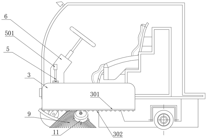 5.根据权利要求1所述的一种环卫清扫装置,其特征在于,所述侧护板(3)的底部外侧焊接有轮舱(301),所述轮舱(301)的底腔中安装有一排橡胶轮(302)。
