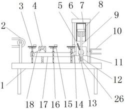 1.一种纸张装订机,包括操作台(1),其特征在于:所述操作台(1)的上表面固定连接有传送带(2)、支撑板(4)、装订架(6)、传送带一(10)、支撑杆(16)与支撑杆二(26),所述从起始段到末端依次排列有传送带(2)、支撑板(4)、装订架(6)与传送带一(10),所述支撑杆二(26)位于装订架(6)内侧,所述支撑杆(16)位于传送带(2)与装订架(6)之间,所述装订架(6)的下表面固定安装有滑槽(8),且滑槽(8)的内部滑动连接有装订机(7),所述装订机(7)的下表面活动连接有连接杆(9),且连接杆(9)的一端固定连接有套环(12),所述支撑杆二(26)的上端固定连接有装订台(11),且装订台(11)的后端设有曲面滑槽(21),所述装订台(11)内部转动连接有曲轴(13),且曲轴(13)的侧表面固定连接有拨动杆(5),所述套环(12)套接于曲轴(13),所述装订台(11)的后端表面设有连接片(14),且连接片(14)的一端转动连接有连接板(17),所述支撑板(4)上端设有主连接片(18),且主连接片(18)的一端与连接板(17)的一端转动连接,所述连接板(17)的上表面固定连接有传送装置(15)。
