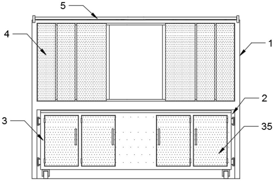 所述存储架(4)包括存储盒(41)、端板(42)、连柱(43)、上滑件(44)、驱动槽(45)、丝杆(46)、连块(47)和电机(48),所述存储盒(41)等距设置在密封槽(6)内,且存储盒(41)外端固定有端板(42),所述存储盒(41)内端固定有连柱(43),所述存储盒(41)两侧均固定有上滑件(44),且存储盒(41)通过上滑件(44)与密封槽(6)内壁滑动连接,所述密封槽(6)底部开设有驱动槽(45),且驱动槽(45)内转动安装有丝杆(46),所述丝杆(46)端部连接有电机(48),所述存储盒(41)底部固定有连块(47),且连块(47)与丝杆(46)啮合连接;