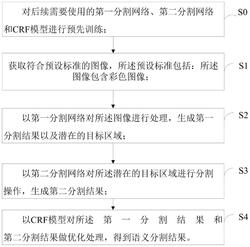 其中,所述第一分割网络为一场景级别的粗略分割网络,所述第二分割网络为一目标级别的细致分割网络,且所述第一分割网络、第二分割网络、CRF模型均为经过预先训练所得,所述训练基于带有轮廓标注的垃圾废弃物训练数据集进行。