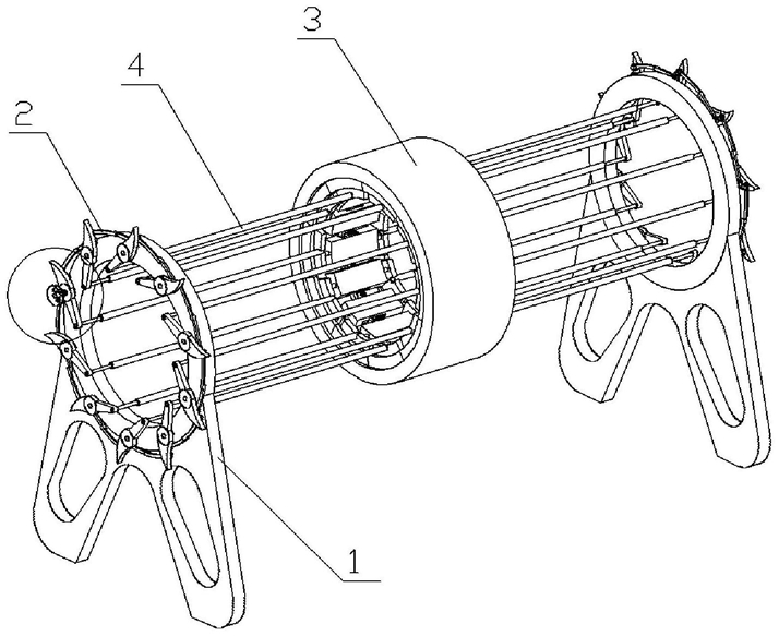所述调距机构(2)包括若干个撬杆(30)和连杆Ⅰ(34),所述撬杆(30)中部设置有与支撑架主体(1)连接的固定轴Ⅲ(31),所述撬杆(30)上端靠近支撑架主体(1)一侧设置有支撑轴Ⅰ(32),所述支撑轴Ⅰ(32)下侧设置有支撑轴Ⅱ(33),所述支撑轴Ⅰ(32)上设置有与相邻一个撬杆(30)的支撑轴Ⅱ(33)连接的连杆Ⅰ(34),所述撬杆(30)下端与所述伸缩杆(26)连接,任意一个撬杆(30)上设置有与固定轴Ⅲ(31)连接的螺杆(35),且所述螺杆(35)上啮合设置有夹紧盘(36)。