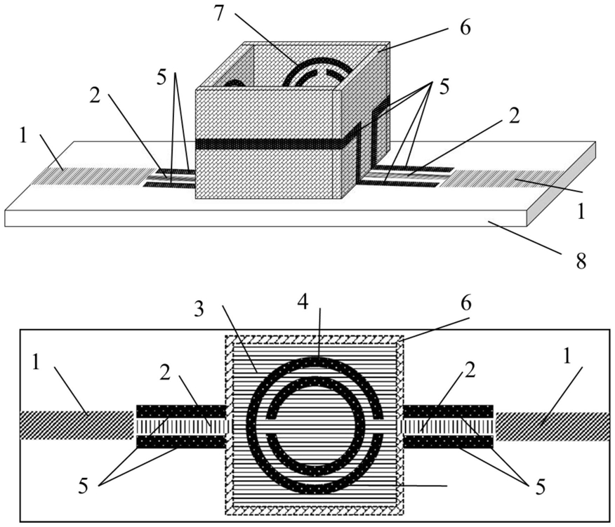 立体容器结构(6)位于介质基板(8)中央,底部为介质基板,通过两条平行耦合线(5)实现馈电。