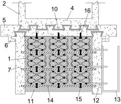 1.一种兼具承载抗震和抗浮能力的地下结构加强体系,包括承载拉压耗能体(1)、地下结构(2)、混凝土垫层(5)、混凝土支撑截水墙(7)、挤压密封耗能填充物(10)、透水砂层(11)、溢流管(12)、集水井(13)、高强抗浮固结板(14)、连接件A(15)、连接件B(16),其特征在于:地下结构(2)的下部设置地下结构底板(4),所述地下结构底板(4)的下部间隔设置梯形凸块(3)和梯形凹槽(9),地下结构底板(4)的下方设置混凝土垫层(5),所述混凝土垫层(5)的上部间隔设置梯形凸块(3)和梯形凹槽(9),混凝土垫层(5)的下部左右两侧均设置L形的抗浮榫槽(6)和梯形凹槽(9),混凝土垫层(5)下方左右两侧均设置混凝土支撑截水墙(7)作为支撑,所述混凝土支撑截水墙(7)的上部设置梯形凸块(3)和凸体卡端(8);