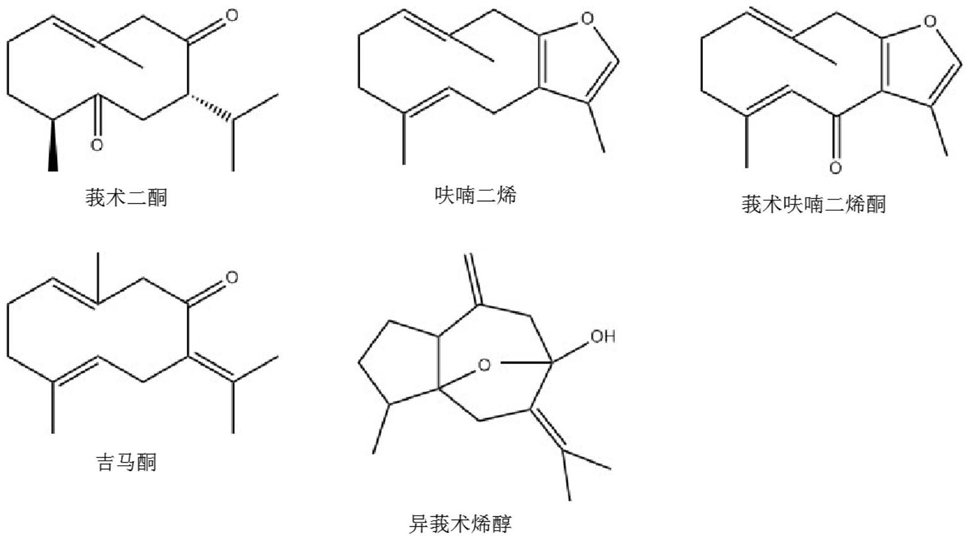 (5)离心、过滤取上清后用HPLC进样分析,提取得到郁金有效成分分别为莪术二酮、异莪术烯醇、莪术呋喃二烯酮、吉马酮、呋喃二烯;