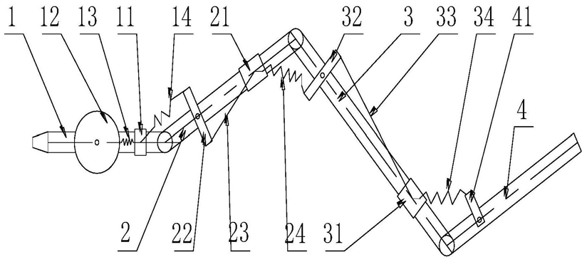 所述蛇尾(4)的前端转动装设有蛇尾曲柄(41),所述蛇尾曲柄(41)的末端与所述蛇身滑块B(31)采用关节弹簧C(34)相连;