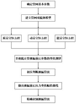 湿式天然气管网压力模型的求解,随着时间步长的增加,管网中冷凝水增加,并沿管道分布在不同位置,同时,水力参数和热力参数受相变和积液的相互影响,由于液体的不断凝结和积聚,使得管网内的水力和热力参数不能完全向稳态发展,一段时间后,通过设置相应的边界条件,计算得出不同泄漏管网中水力和热力参数的变化,首先已知管网的基础数据,将管网初始节点的压力和流量参数代入水力热力数值模拟双流体模型进行计算,然后解非线性方程组,计算导纳矩阵,求节点压力,如果求出的节点压力相比真实节点压力误差小于ε,则根据析水量更新气相质量含气率,直到算出管网中各管段的相关水力参数和热力参数,如果求出的节点压力相比真实节点压力误差大于ε,更新节点压力重新求解;