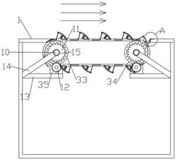 8.根据权利要求7所述的破坏气漩涡形成的风能利用型建筑,其特征在于:所述积水吹扫装置包括第一连板、第二连板和气囊,所述第一连板固设在叶片的内侧,所述第二连板固设在皮带的外侧,所述气囊固设在第一连板和第二连板之间形成的夹角内,所述气囊的外侧设置有吹扫喷头。