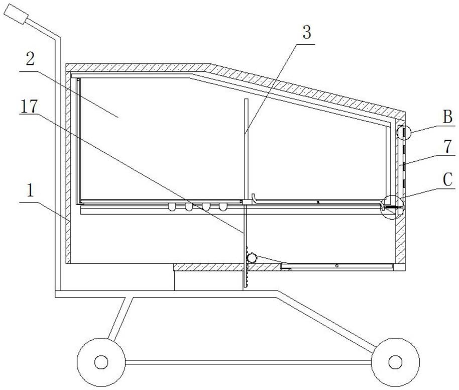 1.一种大型超市用新型购物车内残余商品垃圾清理机构,包括外架体(1),其特征在于:所述外架体(1)的内部放置有内框(2),所述内框(2)的内部固定连接有分隔板(3),所述内框(2)的底部开设有活动口(4),所述活动口(4)的内部转动连接有配重转轴(5),所述配重转轴(5)的外侧固定连接有翻板(6),所述外架体(1)的右壁内部开设有气腔(7),所述外架体(1)的右侧嵌有薄膜(8),所述气腔(7)的内部固定连接有延伸到外架体(1)内部的外套管(9),所述外套管(9)的顶部开设有进气口(10),所述外套管(9)的内部固定连接有外套弹簧(11),手术室外套弹簧(11)的左侧固定连接有中套管(12),所述中套管(12)的内部固定连接有中套弹簧(13),所述中套弹簧(13)的左侧固定连接有内套管(14),所述内套管(14)的内部固定连接有内套弹簧(15),所述内套弹簧(15)的左侧固定连接有插杆(16),所述内框(2)的底部固定连接有齿条(17),所述齿条(17)的右侧啮合有齿轮(18),所述外架体(1)的底部活动连接有转动板(19),所述转动板(19)顶部的左侧滑动连接那有刮板(20),所述刮板(20)与齿轮(19)之间固定连接有连接绳(21)。