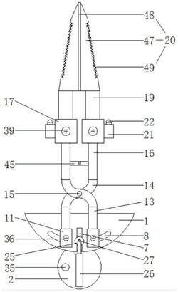 7.根据权利要求1所述的一种用于肝胆胰脾外科的可保护手部综合组织剪,其特征在于,所述刀片(20)包括刀体(47),所述刀体(47)内侧设有刀刃(48),所述刀体(47)外侧设有刀背(49),所述刀背(49)为锯齿形结构。