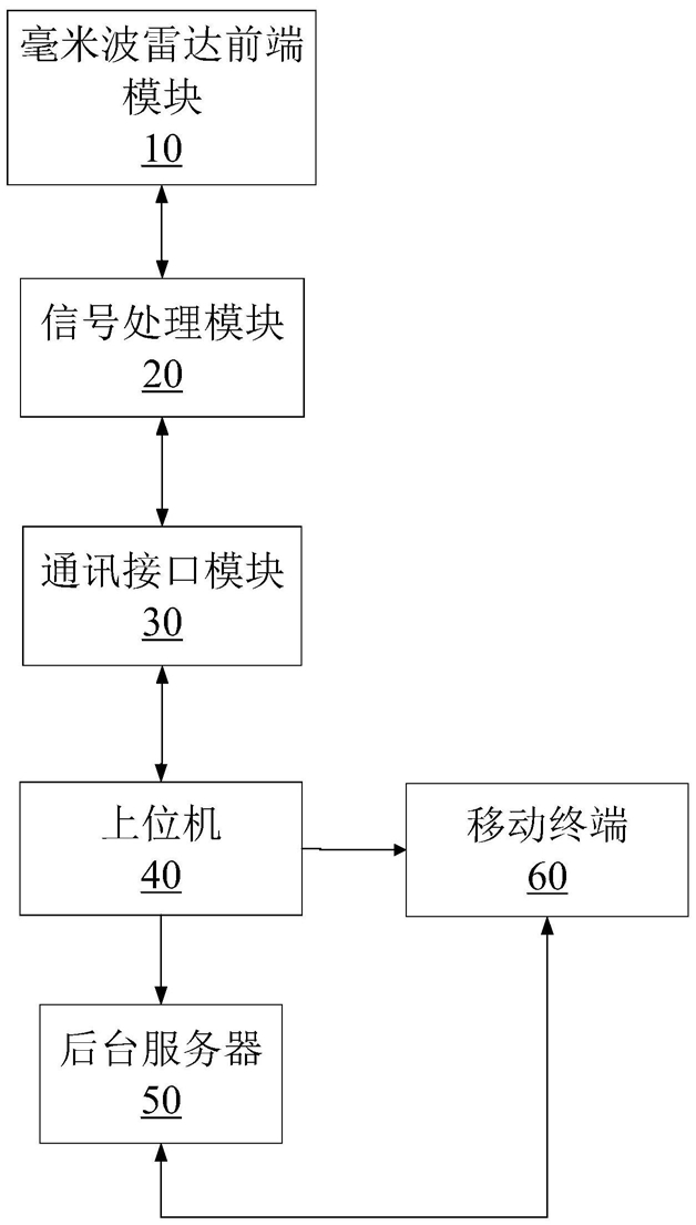 1.一种基于毫米波雷达的体征无接触式智能监测系统,其特征在于,包括毫米波雷达前端模块、信号处理模块、通讯接口模块、上位机、后台服务器和移动终端,其中,所述毫米波雷达前端模块发射和接收毫米波雷达信号,与所述信号处理模块相连接;