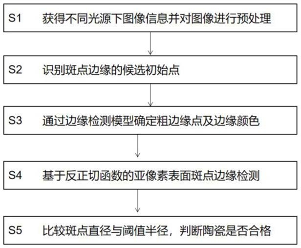 S5、对步骤S4得到的黑色斑点直径、红色斑点直径以及黄色斑点直径进行判断,当黑色斑点直径、红色斑点直径或黄色斑点直径大于设定的斑点阈值时,则判断该陶瓷产品为不合格。
