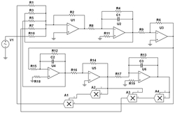 乘法器A2的Y端口与运算放大器U5的输出端相连,乘法器A2的X端口与运算放大器U5的输出端相连,乘法器A2的输出端口与乘法器A1的Y端口相连;乘法器A1的X端口与运算放大器U3的输出端相连;乘法器A4的X端口与运算放大器U6的输出端相连,乘法器A4的输出端口与乘法器A3的X端口相连;乘法器A3的Y端口与运算放大器U5的输出端相连。