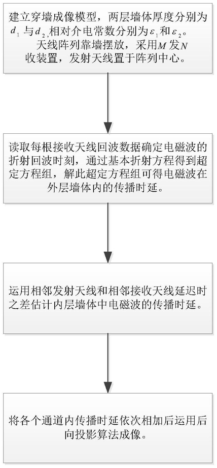 步骤1.基于1≤m≤M、1≤n≤N,采集第m根发射天线发射的发射信号,由第n根接收天线所接收对应该发射信号的接收信号的折射波分别在折射面1的回波时刻qmn和折射面2的回波时刻pmn,分别组成折射波在折射面1的延迟时矩阵q和折射波在折射面2的延迟时矩阵p,其中,M表示发射天线的总数,N表示接收天线的总数,折射面1为内层墙体与空气接触的界面,折射面2为两层墙体接触的界面;