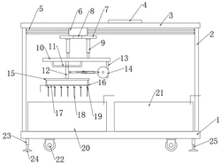 1.一种不锈钢表面镀银装置,包括底座(1),其特征在于,所述底座(1)上固定连接有两个支撑板(2),两个所述支撑板(2)的上端共同固定连接有安装板(3),所述安装板(3)上安装有控制模块(4),两个所述支撑板(2)之间安装有水平位移机构,所述水平位移机构的底部固定连接有衔接板(7),所述衔接板(7)的前侧安装有时间继电器(8),所述衔接板(7)的底部安装有两个电动伸缩杆(9),两个所述电动伸缩杆(9)的输出端共同固定连接有移动板(10),所述移动板(10)的底部固定连接有U型杆(11),所述U型杆(11)上套设有与其滑动连接的滑动块(12),所述滑动块(12)的内顶部与移动板(10)的内顶部相抵且滑动设置,所述移动板(10)的底部安装有驱动电机(34),所述驱动电机(34)与滑动块(12)之间安装有可调节幅度的晃动机构,所述滑动块(12)的底部固定连接有绝缘板(15),所述绝缘板(15)的底部安装有两个绝缘杆(16),两个所述绝缘杆(16)之间固定连接有铜杆(17),所述铜杆(17)的底部固定连接有多个J型铜线(19),多个所述J型铜线(19)上均安装有待镀银不锈钢块(18),所述底座(1)上放置有预镀银槽体(20)和镀银槽体(21),所述底座(1)的底部固定连接有四个行走轮(22)和四个稳定机构;所述水平位移机构包括固定在两个支撑板(2)之间的电动滑轨(5),所述电动滑轨(5)上滑动连接有与其配套的电动滑块(6),所述衔接板(7)安装在电动滑块(6)的底部;所述移动板(10)的底部固定连接有竖板(13),所述驱动电机(34)通过螺栓安装在竖板(13)上;