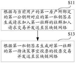 1.一种社群决策方法,其特征在于,区块链上配置有社群合约,所述社群合约中存有房管部门所存证的房产与业主的公钥的对应关系,所述方法适用于用户端,所述方法包括:根据与当前用户的第一房产所绑定的第一公钥所对应的第一私钥签名生成请求加入第一社群的社群加入请求交易并发送至区块链网络,以供区块链节点通过所述社群合约执行,验证所述第一公钥所对应的所述第一房产是否属于所述第一社群:是,则所述社群加入请求交易执行成功,更新所述社群合约中记录的所述第一社群的成员列表;