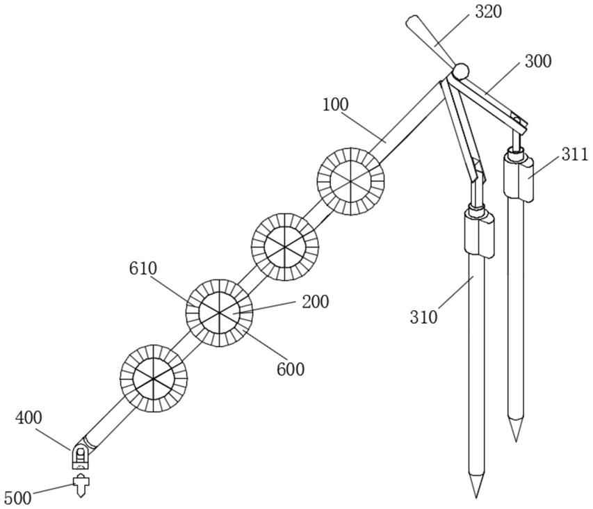 所述支架(300)能够相对棱镜杆(100)旋转,通过把手螺旋(320)与所述棱镜杆(100)固定,所述支架(300)连接有可收缩的金属杆(310),方便调整高度;