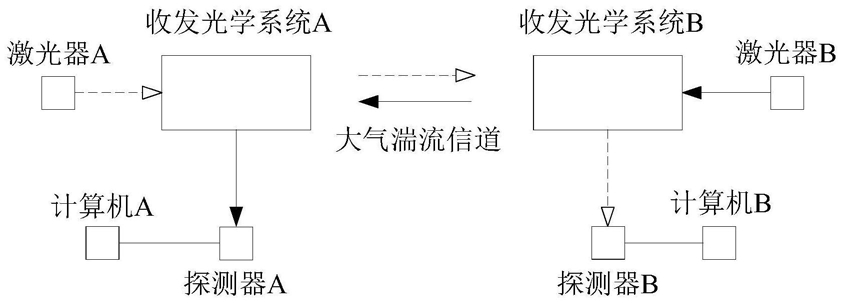 1)本方法的第一部分使激光收发端机A和激光收发端机B正常工作,具体操作包括:使激光器A和激光器B正常工作,使探测器A和探测器B正常工作,使计算机A和计算机B正常工作,使收发光学系统A和收发光学系统B相互对准并正常工作;