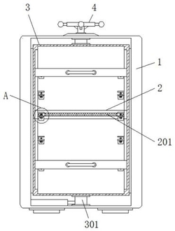 1.一种酒店餐饮用餐具分类存放装置,包括外放置柜(1)、内放置柜(3)、转杆(4)和固定块(6),其特征在于:所述外放置柜(1)外部的顶端活动连接有转杆(4),且转杆(4)的两侧皆固定连接有固定球(401),所述外放置柜(1)内部底端的一侧固定连接有空心块(5),且外放置柜(1)内部的中间位置活动连接有内放置柜(3),所述内放置柜(3)内部的两侧皆固定连接有多个固定块(6),且固定块(6)底端的一侧固定连接有套块(601),所述固定块(6)的内部活动连接有连接板(2),所述固定块(6)一侧的中间位置固定连接有把手(202),且连接板(2)的另一侧固定连接有放置板(201),所述外放置柜(1)内部顶端的两侧皆设置有放置槽(101),且放置槽(101)内部的一侧活动连接有活动块(103),所述活动块(103)的两侧皆设置有活动轴(104),且活动块(103)内部的中间位置设置有卡槽(102),所述连接板(2)一侧的两端皆固定连接有连接块(203),且连接块(203)的内部设置有插孔(204),所述内放置柜(3)底端的中间位置设置有转轴(301),且内放置柜(3)底端的一侧固定连接有弧形杆(302),所述空心块(5)内部的一侧固定连接有弹簧(502),且弹簧(502)的一侧滑动连接有滑动块(501),所述固定块(6)底端的一侧固定连接有固定螺母(603),且固定螺母(603)的内部活动连接有限位螺栓(602),所述固定螺母(603)的内部设置有内螺纹,且限位螺栓(602)的外部设置有与固定螺母(603)内螺纹匹配的外螺纹。
