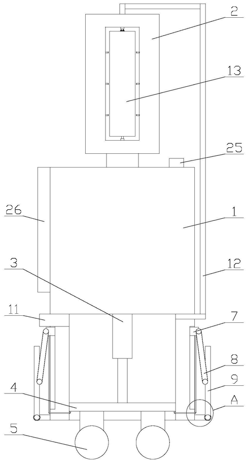 所述稳定机构包括气缸(3)、移动板(4)、进气管(11)、出气管(12)、两个稳定组件和四个车轮(5),所述气缸(3)的缸体竖向固定在凹口内的顶部,所述气缸(3)的气杆与移动板(4)固定连接,所述移动板(4)与凹口匹配,所述移动板(4)与凹口的内壁密封连接,四个车轮(5)分别固定在移动板(4)的下方的四角处,两个稳定组件分别设置在主体(1)的两侧,所述移动板(4)的下方的两侧分别与两个稳定组件连接,所述进气管(11)与凹口连通,所述出气管(12)的一端与凹口连通,所述出气管(12)的另一端与安全机构连接,所述气缸(3)与PLC电连接;