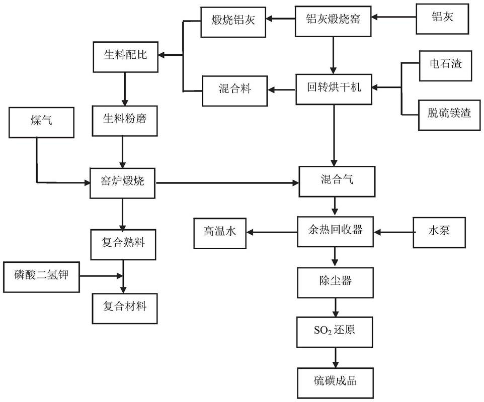 7.如权利要求1所述的硫铝酸盐-磷酸钾镁复合凝胶材料和硫磺联产的方法,其特征是,铝灰煅烧产生的烟气对电石渣与脱硫镁渣混合后烘干提供热量。
