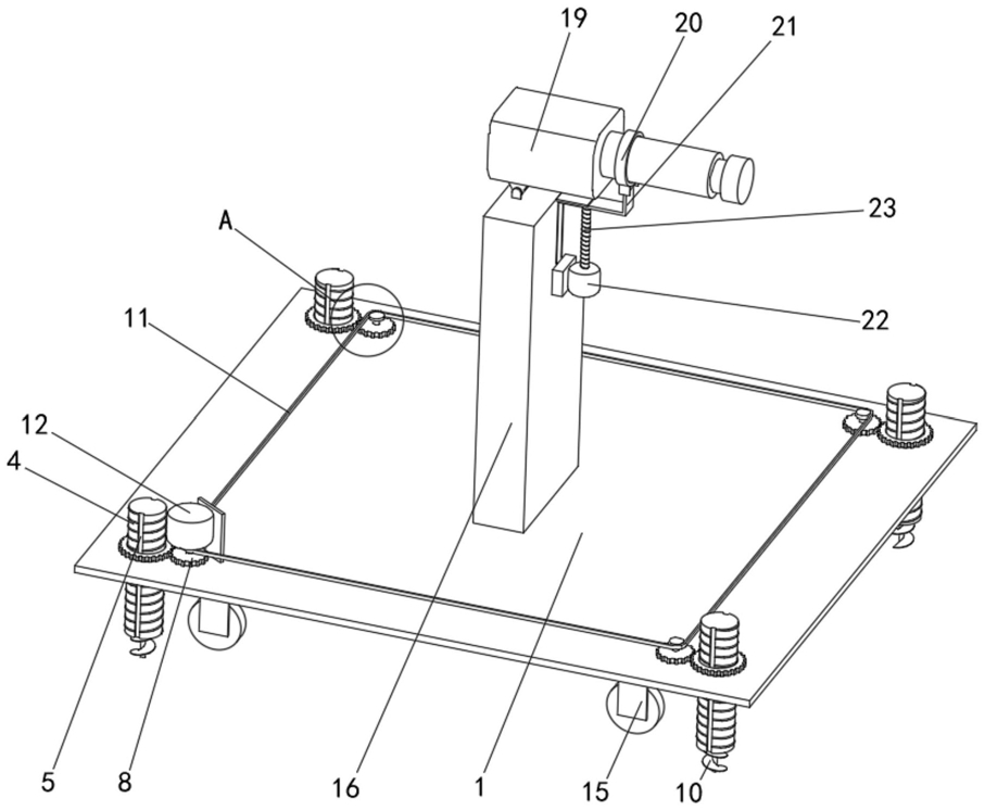 3.根据权利要求1所述的一种矿山巷道工程测量用激光指向仪,其特征在于:所述第二齿轮(8)的顶面固定安装有带轮(9),所述带轮(9)的表面传动连接有皮带(11),所述底板(1)的顶面固定安装有第一电机(12),所述第一电机(12)的输出端固定套接在带轮(9)的顶端,所述底板(1)的底面固定安装有万向轮(15),所述万向轮(15)的高度比第一滚珠丝杠(4)与螺旋板(10)的高度值之和大十厘米,所述带轮(9)共有四个,四个所述带轮(9)均与第一齿轮(7)啮合。