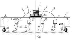 所述频率电流信号发生装置(1)分别与导线一(3)的输入端和导线四(6)的输入端连接,导线一(3)的输出端嵌入滑块四(8)与探针铜电极四(22)的输入端相连,推杆电机四(17)与探针铜电极四(22)的输入端相连,探针铜电极四(22)可在推杆电机四(17)中垂直上下移动;导线四(6)的输出端嵌入滑块一(11)与探针铜电极一(19)的输入端相连,推杆电机一(14)与探针铜电极一(19)的输入端相连,探针铜电极一(19)可在推杆电机一(14)中垂直上下移动;电压采集记录装置(2)分别与导线二(4)的输入端和导线三(5)的输入端连接,导线二(4)的输出端嵌入滑块三(13)与探针铜电极三(21)的输入端相连,推杆电机三(16)与探针铜电极三(21)的输入端相连,探针铜电极三(21)可在推杆电机三(16)中垂直上下移动;导线三(5)的输出端嵌入滑块二(12)与探针铜电极二(20)的输入端相连,推杆电机二(15)与探针铜电极二(20)的输入端相连,探针铜电极二(20)可在推杆电机二(15)中垂直上下移动;滑块一(11)、滑块二(12)、滑块三(13)、滑块四(8)均套在水平绝缘扁杆(10)上,滑块一(11)、滑块二(12)、滑块三(13)、滑块四(8)可在水平绝缘扁杆(10)上灵活的水平左右移动,水平绝缘扁杆(10)左右两端部分别装有阻隔件一(9)和阻隔件二(25),支架一(26)顶部与底部分别连接绝缘外壳(7)和滚轮一(18),支架二(27)顶部与底部分别连接绝缘外壳(7)和滚轮二(23),中心轴线(24)为该平台的垂直中轴线;