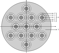 1.一种基于空分‑模分复用技术的双沟槽环绕型多芯少模光纤,其特征在于:包括光纤基底区域(7)及在光纤基底区域(7)中心对称方式排布的多个少模纤芯(6),所述少模纤芯由内而外依次分布有少模芯区(1)、石英内包层(2)、沟槽内包层(3)、石英外包层(4)和沟槽外包层(5);沟槽内包层(3)与沟槽外包层(5)是具有相同折射率的沟槽结构;每个少模纤芯的传输模式数量为5‑8个;所述的多芯少模光纤的直径为125 250μm,少模芯区(1)直径为10~