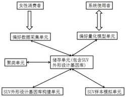 偏好量化模型单元,其根据SUV车型图片的外形设计特征及不同群组女性消费者对该图片对应的偏好数据,得到各外形设计特征在各群组女性消费者偏好中所占的权重、以及外形设计特征下不同基因的具体贡献率,并构建不同群组女性消费者的偏好量化模型;所述的偏好量化模型可根据不同SUV外形设计基因组合而成的设计方案给出方案对应的偏好数值,或者通过设定女性消费群组的目标偏好数值给出对应的SUV外形设计基因组合。