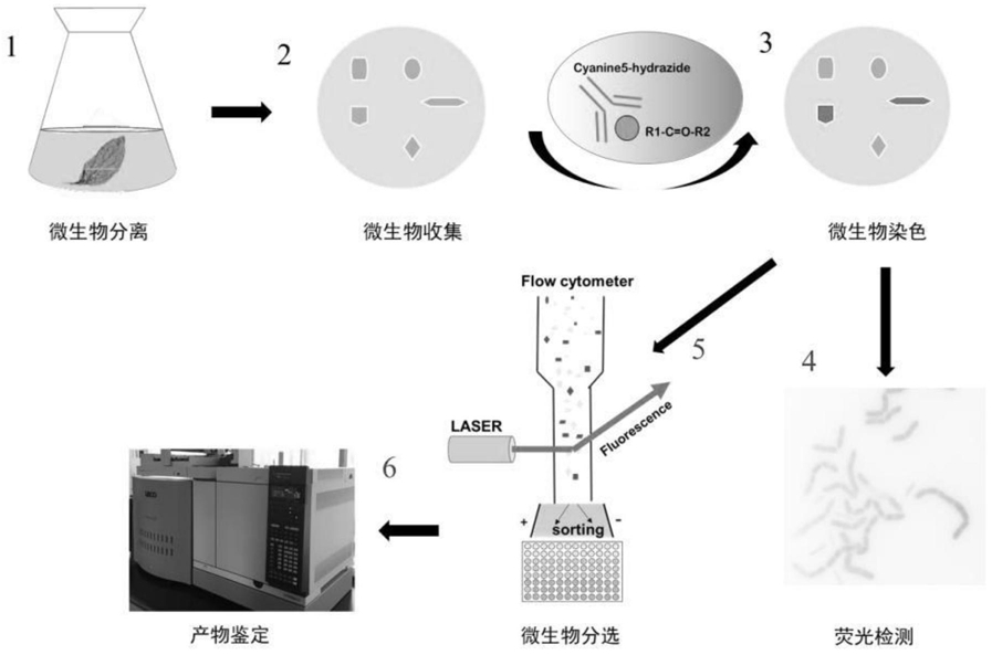 3.如权利要求1所述的一种筛选产醛或酮类风味物质细菌的高通量方法,其特征在于,所述步骤(2)中微生物的染色是先加入1‑2 mL的缓冲液重悬微生物,然后加入荧光染料cy5‑hydrazide至体系中,染料浓度为1‑2 mg/mL,并在暗处染色1‑2 h。