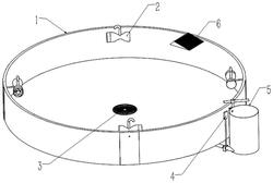 鱼塘(1),所述鱼塘(1)形成为圆形,所述鱼塘(1)的内周壁从所述鱼塘(1)顶部至所述鱼塘(1)的底部均为同心圆,且从所述鱼塘(1)顶部至所述鱼塘(1)的底部的方向上,所述鱼塘(1)的半径相等或部分位置的半径逐渐减小,所述鱼塘(1)的内底壁为水平平面,所述鱼塘(1)的底壁的中心设有与所述鱼塘(1)的底壁同心的圆孔排污口,所述圆孔排污口的直径在1000mm‑2000mm之间;