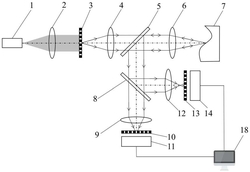 1.基于差动彩色共焦技术的自由曲面测量装置,它包括:计算机(18),其特征是,它还包括:彩色光源(1)、A聚焦物镜(2)、照明小孔阵列板(3)、B聚焦物镜(4)、A分光棱镜(5)、彩色物镜(6)、待测曲面(7)、B分光棱镜(8)、C聚焦物镜(9)、A探测小孔阵列板(10)、A面阵彩色光电探测器(11)、D聚焦物镜(12)、B探测小孔阵列板(13)、B面阵彩色光电探测器(14),在所述的A探测小孔阵列板(10)后方设置A面阵彩色光电探测器(11),在所述的B探测小孔阵列板(13)后方设置B面阵彩色光电探测器(14),所述的A面阵彩色光电探测器(11)和B面阵彩色光电探测器(14)分别与计算机(18)电连接;