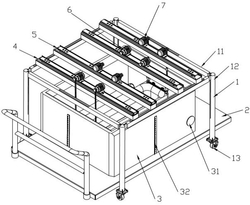 7.根据权利要求1所述的沉船打捞试验台,其特征在于:所述的移动支架包括方形框架和支撑在方形框架四个顶点的四个立柱,每个立柱的底部设置有滚轮,其中位于同一侧的两个滚轮上设置有制动装置,所述的平板车也设置有制动装置。