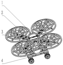 接板(401)、伸缩杆(402)、滑块(403)、滑台(404)、电机支架(405)、电机(406)、车轮(407)以及连接支架(408);所述车型下体(4)的连接板(401)用于安装旋翼(3),连接板(401)的底部用固定四个连接支架(408),连接支架(408)与伸缩杆(402)的上端连接,伸缩杆(402)的另一端通过连接支架固定在滑块(403)上,所述滑块(403)安装在滑台(404)内,允许滑块(403)带动滑块(403)上端装置在一定距离内平移;每根长轨的下方各在前后相同位置处安装一个电机支架(405),电机(406)固定安装在电机支架(405)上,用于控制车轮(407)的前进与后退,电机(406)的输出轴上各安装一个车轮(407)。