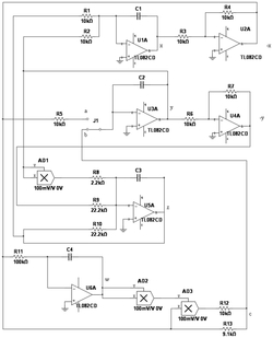 第三通道中第一模拟乘法器(AD1)的两个输入端口都与第三运算放大器的输出端相连,第一模拟乘法器的输出端与第八个电阻(R8)相连,第八个电阻的另一端与第五运算放大器的反向输入端相连,第九个电阻(R9)一端与第四运算放大器的输出端相连,另一端与第五运算放大器的反向输入端相连,第十个电阻(R10)一端与第五运算放大器的反向输入端相连,另一端与第五运算放大器的输出端相连,第五运算放大器的输出端为z信号;
