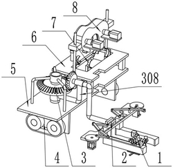 所述的传送装置(3)还包括主动锥齿轮支架(302)、主动锥齿轮(303)、锥齿轮驱动电机(305)、支撑弯杆(307),所述的主动锥齿轮支架(302)固定安装在固定支撑板(5)上,主动锥齿轮(303)与从动锥齿轮(301)形成齿轮配合,锥齿轮驱动电机(305)固定安装在锥齿轮驱动电机座(306)上,锥齿轮驱动电机(305)的输出轴与主动锥齿轮轴(304)的下端固定连接,支撑弯杆(307)一端同轴转动安装在主动锥齿轮轴(304)上,另一端转动安装在从动锥齿轮(301)上;