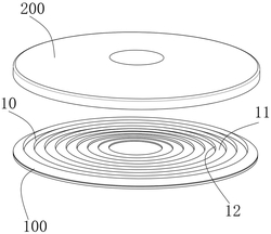 所述偏光罩(200)盖合于所述菲涅尔透镜本体(100)上,并与所述菲涅尔透镜本体(100)形成封闭空间,所述多个光学部(10)位于所述封闭空间内,所述偏光罩(200)的内侧面为圆锥面,所述偏光罩(200)的内侧面设有多个同轴线设置的偏光环(20),所述多个偏光环(20)一一对应位于所述多个光学部(10)的光学无效面(12)的正上方,每个所述偏光环(20)的截面形状为平行四边形,且所述多个偏光环(20)的纵向高度和横向宽度均随着所述光学部(10)的有效厚度的增大而增大。