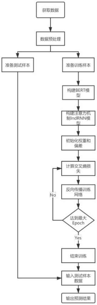 1.一种基于BERT和独立循环神经网络的问句分类方法,其特征在于,包括:实时获取待分类的问句数据,将待分类的问句数据输入到训练好的问句分类模型中,得到分类后的数据;问句分类模型包括BERT模型和基于注意力机制的独立循环神经网络IndRNN模型;对问句分类模型进行训练的过程包括:S1:获取社区问答问句原始数据集,对社区问答问句原始数据集进行预处理,得到训练集、验证集和测试集;S2:将训练集中的数据输入到BERT模型中提取特征,得到含有语义特征的序列向量;S3:将含有语义特征的序列向量输入到基于注意力机制的IndRNN模型中,得到独立循环神经网络隐藏状态;S4:将独立循环神经网络的隐藏状态进行叠加,在进行叠加过程中采用注意力机制捕获上下文的相关信息,得到神经网络输出结果;S5:将神经网络的输出结果输入到softmax层,得到分类结果;S6:根据分类结果计算基于注意力机制的IndRNN模型的损失函数;S7:采用Adam算法对损失函数进行优化,对基于注意力机制的IndRNN模型反向传播训练,不断修改、更新各层神经元的参数值以及连接权重;S8:将验证集中的数据输入到问句分类模型中,确定模型参数的最佳值,使误差值达到最小,完成问句分类模型的训练;S9:将测试集中的数据输入到训练好的问句分类模型中,得到预测结果。2.根据权利要求1所述的一种基于BERT和独立循环神经网络的问句分类方法,其特征在于,对社区问答问句原始数据集进行预处理的过程包括:对数据集进行清洗,去除数据集中重复和残缺的问句语句;将清洗后的数据集按70%:15%:15%的比例划分为训练集、验证集和测试集。3.根据权利要求1所述的一种基于BERT和独立循环神经网络的问句分类方法,其特征在于,得到含有语义特征的序列向量的过程包括:S21:将训练集中的数据划分为标签和内容,再将划分后的内容数据进行分词处理,得到分词文本序列;S22:对分词文本序列进行全词掩码处理,对处理好后序列的头部添加一个特殊标记[CLS],每个句子采用标记[SEP]分隔;S23:将标记后的序列向量输入到双向Transformer编码器中提取特征向量;S24:采用多头注意力机制对提取的特征向量进行拼接,得到含有语义特征的序列向量。4.根据权利要求3所述的一种基于BERT和独立循环神经网络的问句分类方法,其特征在于,采用多头注意力机制对提取的特征向量进行拼接的公式为:MultiHead(Q,K,V)=Concat(head1,...,headn)WOheadi=Attention(QWiQ,KWiK,VWiV)其中,MultiHead(.)表示多头注意力head数;Q表示查询向量,K表示键向量、V表示值向量;Concat(.)表示拼接不同的注意力;headi表示不同的注意力;WO表示MultiHead线性变换的参数。5.根据权利要求1所述的一种基于BERT和独立循环神经网络的问句分类方法,其特征在于,得到独立循环神经网络隐藏状态的过程为:S31:神经元cell获取语义特征的序列向量xt和上一个神经元输出的循环神经网络隐藏状态ht-1;S32:将参数矩阵u和上一个神经元的输出ht-1进行点乘运算,将参数矩阵w与语义特征的序列向量xt相乘,将上述点乘运算结果与乘法运算结果相加,并加上偏置项b,得到待激活序列向量;S33:将待激活序列向量传给激活函数σ得到循环神经网络隐藏状态ht;S34:输出独立循环神经网络的隐藏状态ht并将其传给下一个神经元cell;计算独立循环神经网络隐藏状态的公式为:hit=σ(w·xit+u ⊙hi(t-1)+b)其中,hit表示当前第i位置t时刻神经元输出,σ(.)表示激活函数,w表示参数矩阵,u表示参数矩阵,hi(t-1)表示第i位置的上一个神经元输出,⊙表示点乘,b表示偏置项。6.根据权利要求1所述的一种基于BERT和独立循环神经网络的问句分类方法,其特征在于,得到隐藏状态的过程包括:S41:将独立循环神经网络的隐藏状态进行双向叠加,得到当前隐藏层状态hi;其中,和表示前向和后向IndRNN隐藏状态;Ti表示i位置单词经过BERT层输出的向量;n表示单词个数;hi表示当前隐藏层状态;S42:根据当前隐藏层状态hi计算当前单词注意力权重ai,计算公式为:ui=tanh(Wshi+bs)