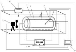 第一步,搭建干式车载牵引变压器风道耐污等级测试平台包括低压绕组生热装置(1)、高压绕组生热装置(2)、环氧树脂绝缘层(3)、风机(4)、温度传感器a(5)、温度传感器b(6)、温度传感器c(7)、模拟电源(8)、计算机终端(9)、污秽发生器(10)、实验箱(11);低压绕组生热装置(1)和高压绕组生热装置(2)分别连接模拟电源(8)和计算机终端(9),计算机终端(9)控制模拟电源(8)产生不同大小的电流,从而使低压绕组生热装置(1)和高压绕组生热装置(2)模拟额定负载下干式车载牵引变压器绕组的发热;低压绕组生热装置(1)和高压绕组生热装置(2)表面分别浇注环氧树脂绝缘层(3);温度传感器a(5)布置在风道出口侧风道中,温度传感器b(6)布置在风道出口侧低压绕组生热装置(1)表面的环氧树脂绝缘层(3)表面,温度传感器c(7)布置在风道出口侧低压绕组生热装置(1)上,三个温度传感器均与计算机终端(9)连接;风机(4)用于产生不同风速的风模拟对应列车风速的列车风;污秽发生器(10)的喷头穿过实验箱(11)箱顶,用于将污秽发生器(10)产生的污秽均匀喷入实验箱(11)中;