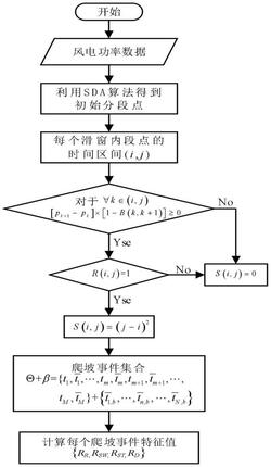 式中,pk+1和pk分别为(k+1)和k时刻的风电功率值;B(·)为bump事件准则,在时间区间(k,k+1)内当bump事件发生时B(k,k+1)=1,反之B(k,k+1)=0;识别上爬坡事件时,当pk+1‑pk>0时算法继续执行,即根据目标函数P(i,j)及其约束条件识别爬坡;