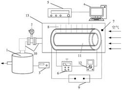1.一种干式车载牵引变压器散热特性评估方法,其特征在于,包括以下步骤:第一步、搭建干式车载牵引变压器散热特性测试平台搭建干式车载牵引变压器散热特性测试平台,该平台包括高压鼓风机(1)、流量计(2)、转速调节器(3)、电脑终端(4)、多通道数据记录仪(5)、电压表(6)、流速计(7)、分布式温度传感器(8)、模拟负载电源(9)、气管(10)、干式车载牵引变压器(11)、万用表(12)、试验箱(13);高压鼓风机(1)通过气管(10)与干式车载牵引变压器(11)相连,在高压鼓风机(1)的作用下,空气由右侧的试验箱(13)进入干式车载变压器(11)实现绕组的冷却,转速调节器(3)与高压鼓风机(1)相连用于实现空气风速的调节与控制;模拟负载电源(9)与干式车载牵引变压器(11)相连,在电脑终端(4)的控制下可以实现不同负载系数下的加热;电压表(6)与万用表(12)均与干式车载牵引变压器(11)相连,实现对其电压电流的实时监测;将分布式温度传感器(8)粘贴在干式车载牵引变压器(11)的绕组导体上,所有温度数据均通过多通道数据记录仪(5)实时记录,并由电脑终端(4)显示,实现温度的实时监测,同时电脑终端(4)根据实时的温度数据,记录绕组导体热点温度达到稳定的时间;