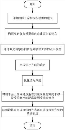 步骤1:建立自由曲面上涂料沉积模型;在自由曲面上的涂料沉积模型中,s是自由曲面上任意一点,n是s处的法向量,O是喷枪在自由曲面上的垂直投影点,P1是O处的切平面,h是喷枪的喷涂高度,P2经过s且与P1平行,hs是喷枪与s之间的垂直距离,Ls是s和喷枪之间的连接线,θ是Ls和喷枪中垂线之间的夹角,γ是Ls和n之间的夹角;C1是喷枪在P1上喷出的一块圆形面,C2为C1在P2上的投影;s处的涂料沉积模型为:步骤2:在自由曲面上建立椭圆双β分布模型;椭圆双β分布模型是通过喷涂实验数据获取的,选取椭圆双β分布模型作为喷枪的涂料沉积模型;对于椭圆双β分布模型,从喷枪中喷出的涂料在平面上形成一个椭圆形的喷涂面;椭圆双β分布模型中任意一点单位时间的涂料厚度d(x,y)为:其中,‑a≤x≤a, kmax是单位时间整个喷涂区域内最大涂
