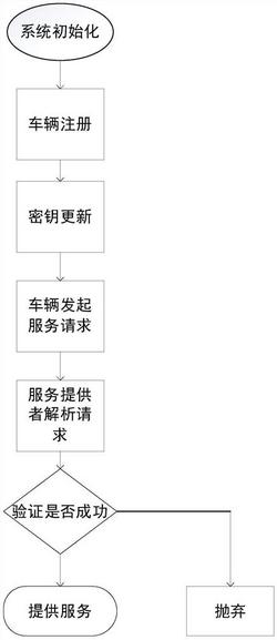 服务提供者:提供服务,对于车辆的服务请求,用从可信授权中心那得到的最初公钥,可以认证用实时密钥加密信息发送过来的车辆,验证完成后提供相应的增值服务。